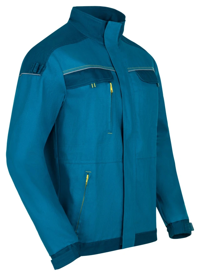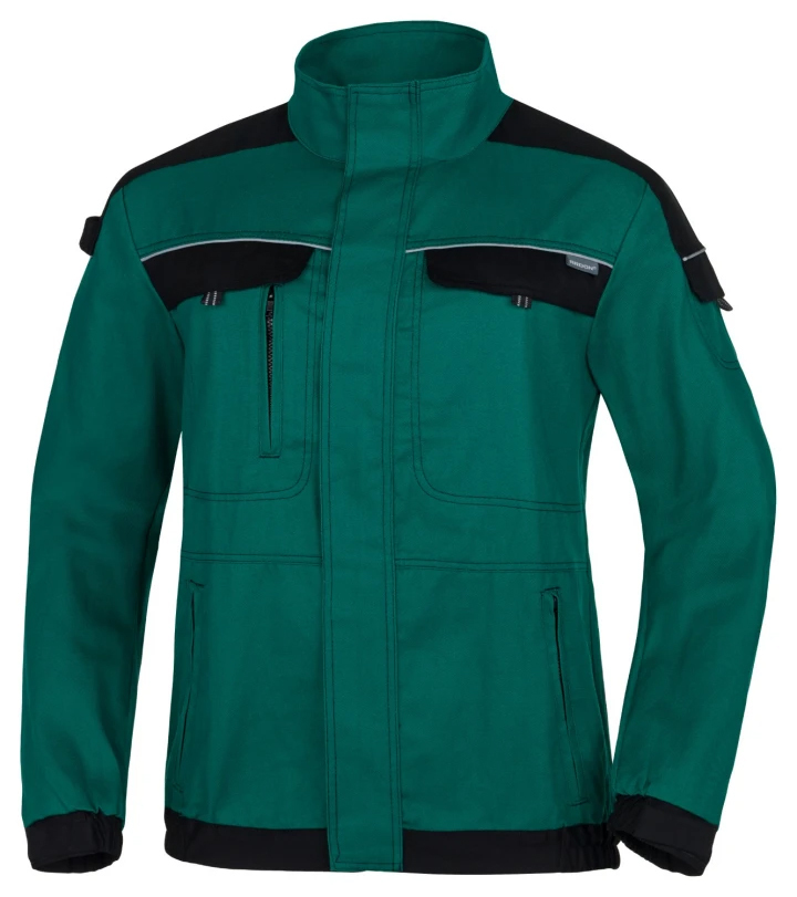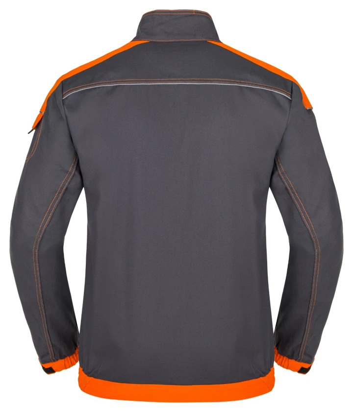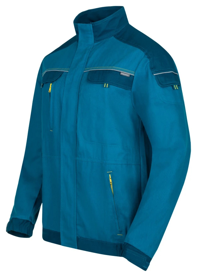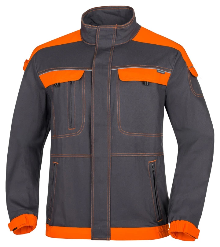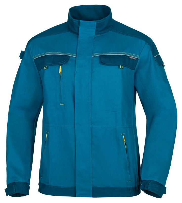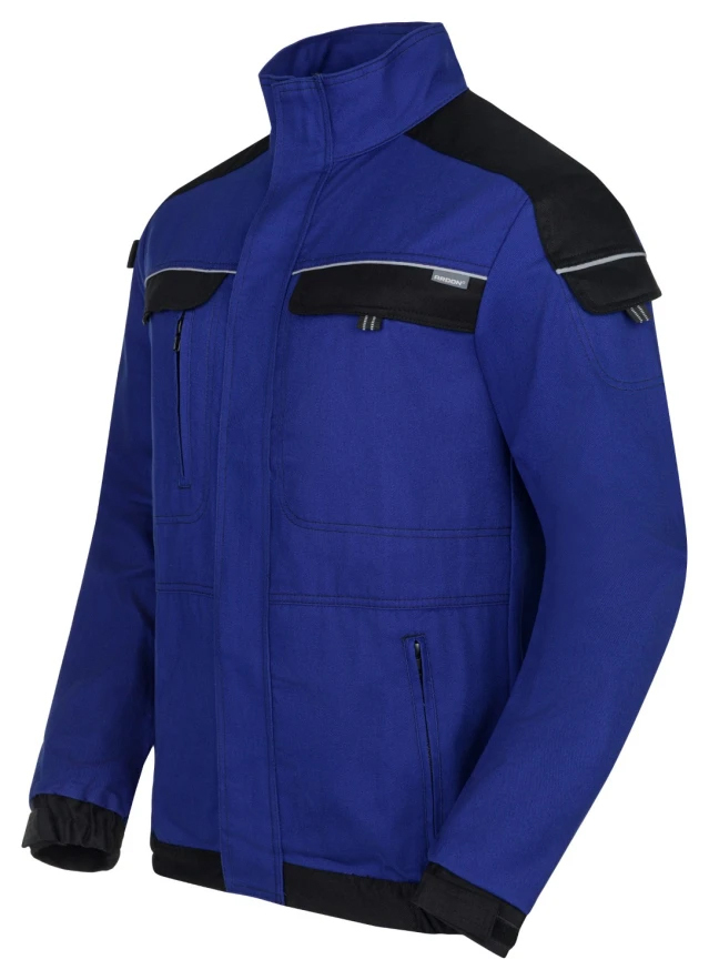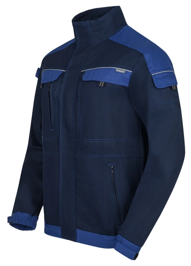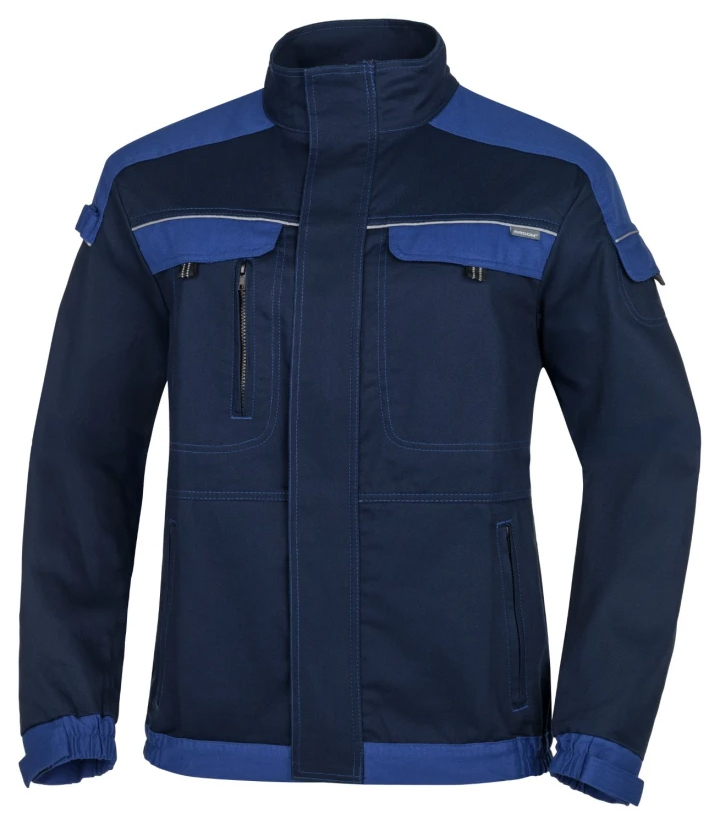 Klasická montérková pracovná blúza, zapínanie na zips, nastaviteľná šírka rukávov, kontrastné sedlo, náprsné vrecká na suchý zips, náprsné vrecko na telefón na zips, 2 spodné vrecká na zips, vrecko na ľavom rukáve s reflexnými doplnkami, materiál 100% bavlna, keprová väzba.