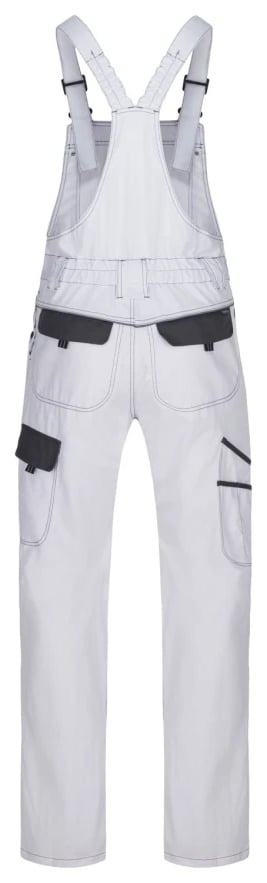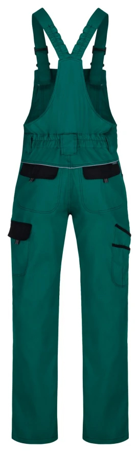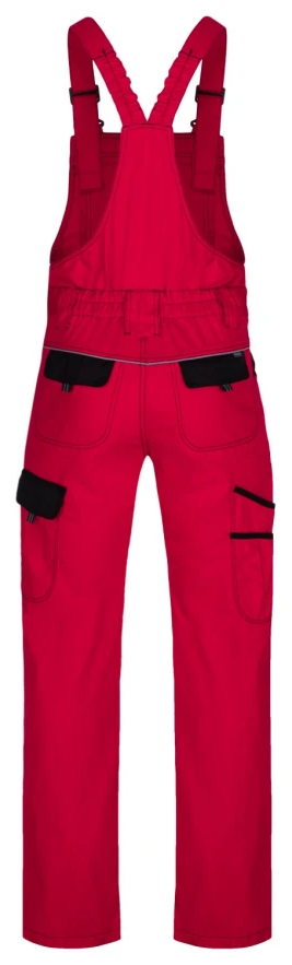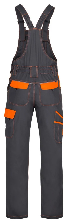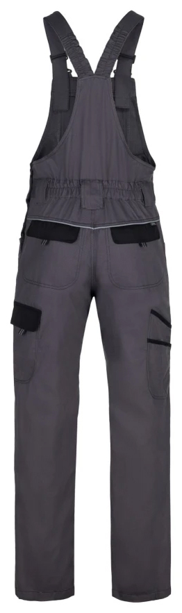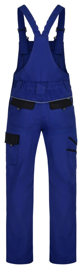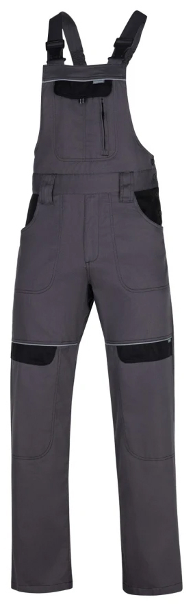 Klasické montérkové nohavice športového strihu s náprsenkou, zapínanie na gombíky na ľavom boku, guma v páse pre pohodlné nosenie, 2 zadné vrecká, zosilnené kolená, bočné multifunkčné vrecká na náradie na nohaviciach, elastické traky, multifunkčné vrecko na náprsenke, reflexné prvky, materiál 100% bavlna, keprová väzba.