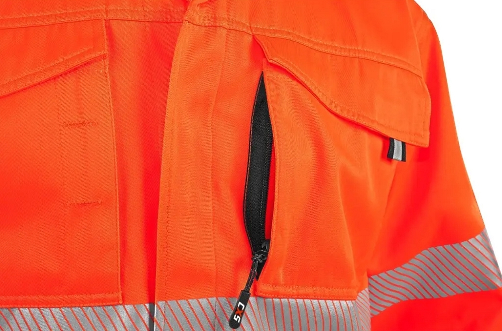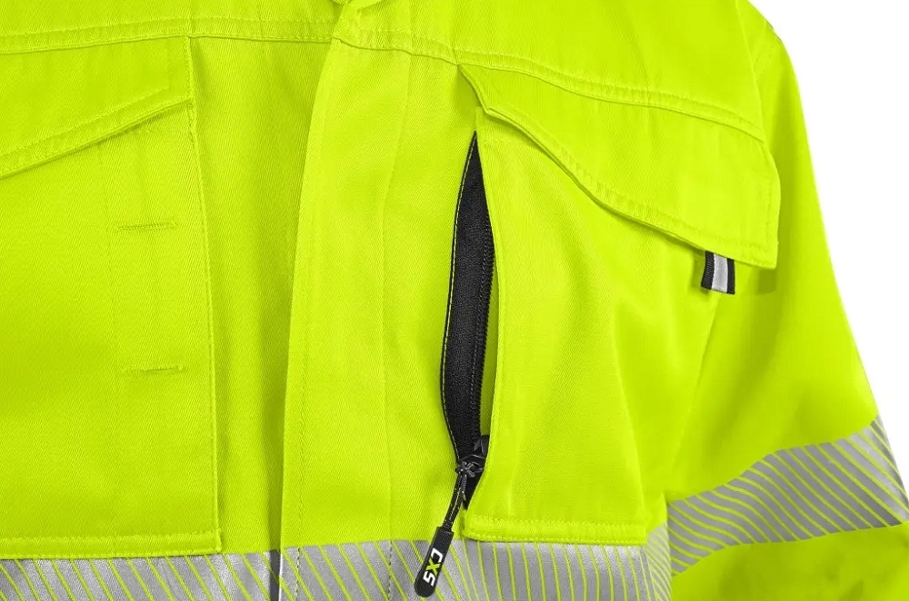 Pánska výstražná blúza CXS NORWICH ponúka vysokú viditeľnosť vďaka segmentovaným reflexným pásikom so šírkou 5 cm a je vyrobená z pevnej keprovej tkaniny (65 % polyester, 35 % bavlna) s gramážou 280 g/m², ktorá zaručuje odolnosť a dlhú životnosť. Blúza má kryté zapínanie na plastové gombíky, praktické náprsné vrecká s klopou na suchý zips – ľavé obsahuje skrytú kapsu na zips, pravé je doplnené o menšie vrecko na ceruzku – a tiež bočné vrecká. Manžety na rukávoch sú nastaviteľné pomocou plastového gombíka. Spĺňa normu EN ISO 20471 a certifikáciu OEKO-TEX® STANDARD 100, čo z nej robí bezpečnú a spoľahlivú voľbu pre stavebníctvo, cestárov, vodičov, pracovníkov údržby, logistiky, leteckej a lodnej dopravy, komunálnych služieb aj záchranárov.