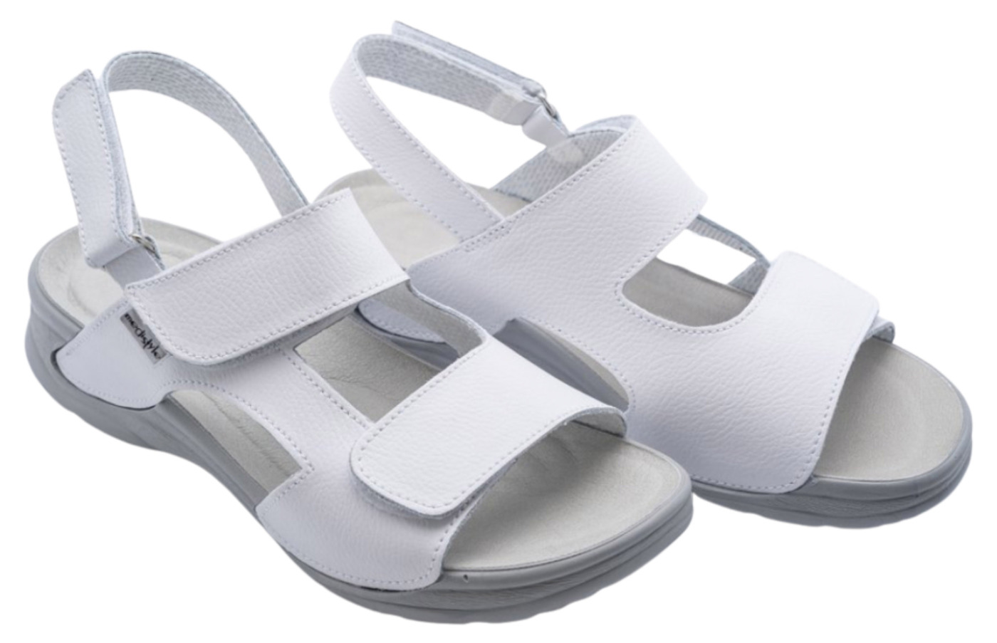 Dámske zdravotné sandále Mirka sú jedným z najdlhšie predávaných a osvedčených modelov, ktoré poskytujú vynikajúci komfort a stabilitu pri každom kroku. Podošva je špeciálne tvarovaná so širším predným dielom, čo zvyšuje stabilitu a pohodlie pri chôdzi. Tento model je ideálny pre osoby s plochými nohami, pretože anatomické tvarovanie vnútorného priestoru poskytuje podporu chodidlu a napomáha udržiavať správne držanie tela. Hygienická stielka zabezpečuje optimálne podmienky pre nohy, čo prispieva k celodennému pohodliu. Variabilné pásky na suchý zips umožňujú jednoduché prispôsobenie šírky sandálov podľa potreby, čím zaručujú maximálny komfort počas celého dňa. Mirka je ideálnou voľbou pre tých, ktorí hľadajú pohodlné, stabilné a praktické sandále na každodenné nosenie – do práce aj na voľný čas.